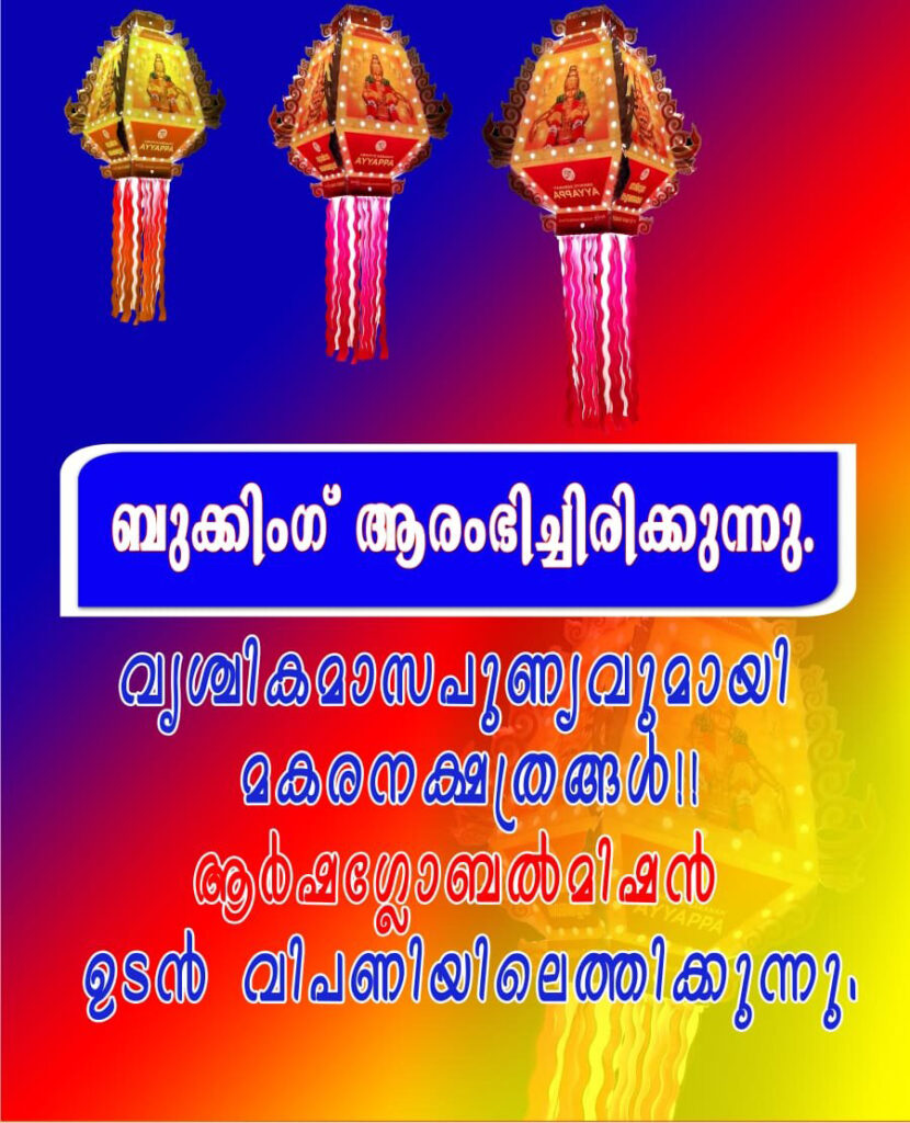 avs-news • Makara Nakshatra December 25, 2023 • No Comments മകര ദീപങ്ങൾനമസ്തേ; മണ്ഡല കാല പുണ്യ ദിനങ്ങളെ വർണ്ണാഭമാക്കാനായി മകര ദീപങ്ങൾഎത്തിക്കഴിഞ്ഞു. എല്ലാ ഹിന്ദു ഭവനങ്ങളും ഈ മണ്ഡല കാലത്ത് ഭക്തിസാന്ദ്രമാകട്ടെ.The Makara Lamps (Makara Nakshatras) have arrived to brighten up the Mandala holy days. May all Hindu homes be devotional during this Mandala Period. Share this:FacebookXLike this:Like Loading... Related Topics